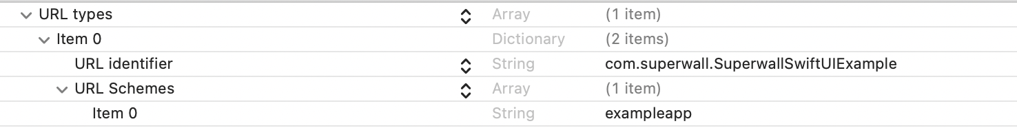 Open Xcode. In your info.plist, add a row called URL Types. Expand the automatically created Item 0, and inside the URL identifier value field, type your Bundle ID, e.g., com.superwall.Superwall-SwiftUI. Add another row to Item 0 called URL Schemes and set its Item 0 to a URL scheme you'd like to use for your app, e.g., exampleapp. Your structure should look like this: