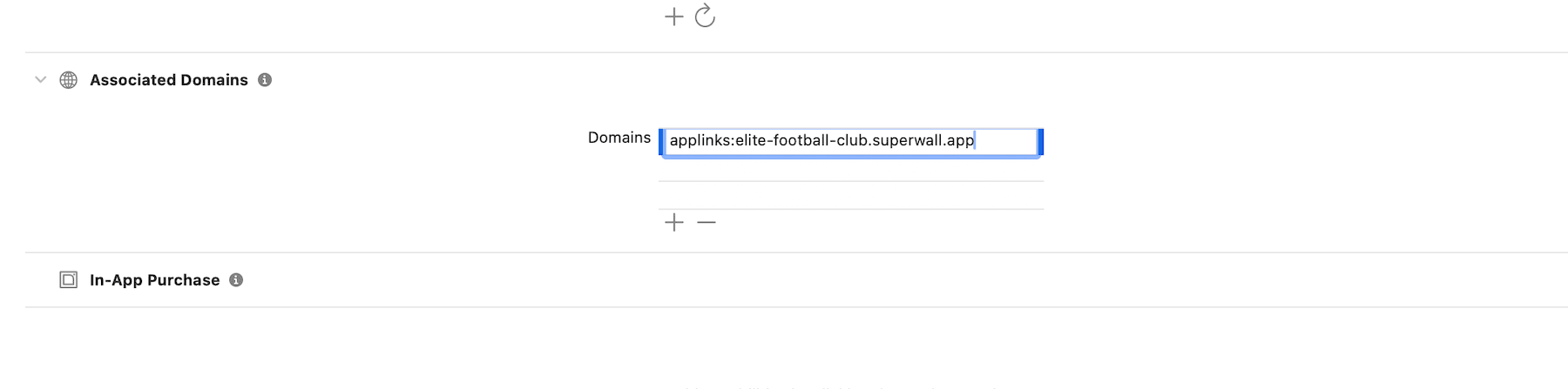 Next, enter in the domain using the format applinks:[your-web-checkout-url]. This is the domain that Superwall will use to handle universal links. Your your-web-checkout-url value should match what's under the "Web Paywall Domain" section.